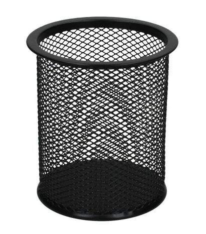 Kubki wykonane są z wysokiej jakości siateczki metalowej. Kubek duży okrągły na długopisy i inne przybory do pisania. Średnica 90mm, wysokość 100mm.