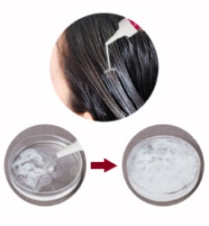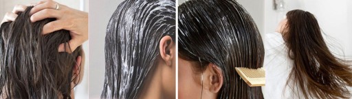 - Umyj włosy ulubionym szamponem, następnie równomiernie rozprowadź płyn na całej długości włosów. Płynna formuła od razu zacznie zmieniać się w gęsta maskę.