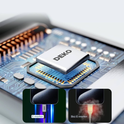 Kabel DEKO USB 3.2 ma w sobie coś więcej. Wyposażony w chip e-Mark, stabilizuje pracę i optymalizuje prędkości ładowania i transferu danych. To jak inteligentny asystent, dbający o Twoje urządzenia tak aby efektywny, szybszy, bardziej niezawodny i bezpieczny.