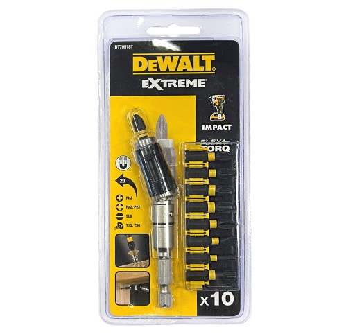 DeWalt 10 cz zestaw końcówek wkrętarskich Torsion DT70518T zestaw udarowych końcówek Torsion do wkrętarki 1/4" DT70518T firmy DeWALT składa się z 9 szt. wzmocnionych końcówek udarowych z mocowaniem na sześciokąt 1/4" + dodatkowo kątowy adapter magnetyczny.