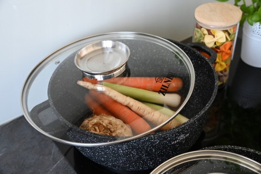 Unikalna kompozycja aluminiowego korpusu i ferromagnetycznego dna umożliwia użytkowanie tych aluminiowych garnków na kuchni indukcyjnej!