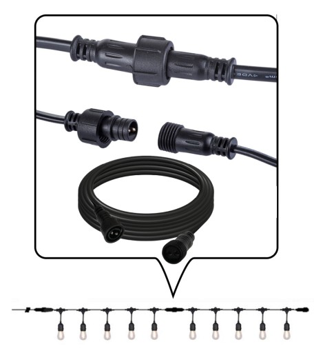 - Przedłużacz posiada odpowiedni wejście i wyjście aby połączyć ze sobą dwie girlandy lub przedłużyć girlandę. ( gdy brakuje nam paru metrów aby wpasowała się do gniazdka 230V)
