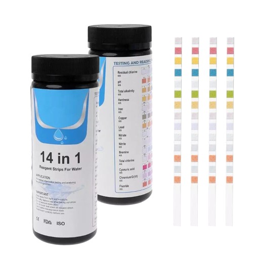 Paski odczynnikowe 14 w 1 do wody: testuj całkowitą zasadowość, pH, twardość, miedź, żelazo, ,/(VI), brom, azotan, azotyn, chlor, siarczyn