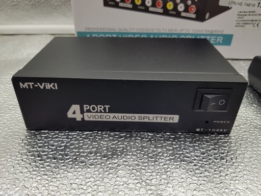 - MT-VIKI 104AV, 4-kierunkowy rozdzielacz audio RCA, 1 zestaw wejść audio i wideo można powielać/odzwierciedlać 4 zestawy wyjść audio i wideo.