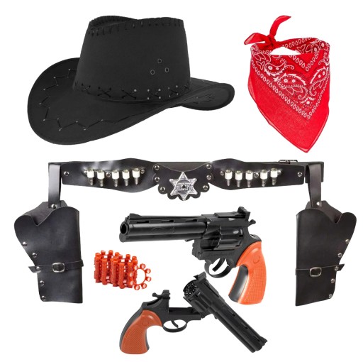 КОМПЛЕКТ КОВБОЙСКОГО НАРЯДА, ЧЕРНАЯ ШЛЯПА, БАНДАМА, КОБУРА, 2 РЕВОЛЬВЕРА + КЕПКИ.