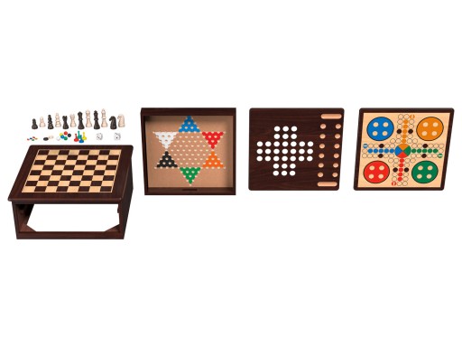 Zawartość zestawu: szachy, warcaby, tryktrak, mankala, kółko i krzyżyk, trylma, węże i drabiny, ludo (Pachisi), solitaire, kości