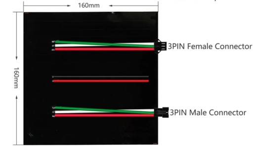 Panel posiada przylutowane dwa złącza (męskie oraz żeńskie), do możliwości łączenia ze sobą większej ilości paneli aRGB, jak i dwa przewody (czerwony oraz biały/czarny) służące jako zasilanie panelu.