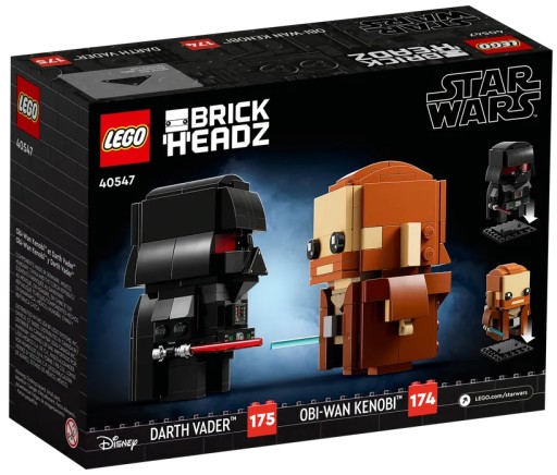- Kultowe postacie z serii Star Wars™ w wersjach LEGO® BrickHeadz™ — figurki do zbudowania LEGO BrickHeadz Obi-Wan Kenobi i Darth Vader (40547) z mieczami świetlnymi