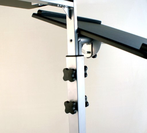 Blat posiada regulację kąta nachylenia oraz ogranicznik, który zapobiega zsunięciu się umieszczonych na nim przedmiotów, np. laptopa.