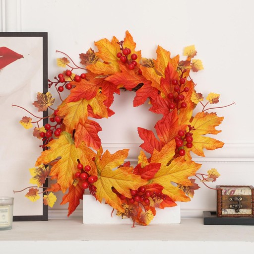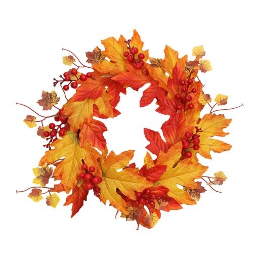 [Jesienny wieniec] Piękny wieniec z liści klonu z jagodami, żywy i realistyczny, idealny na drzwi wejściowe.