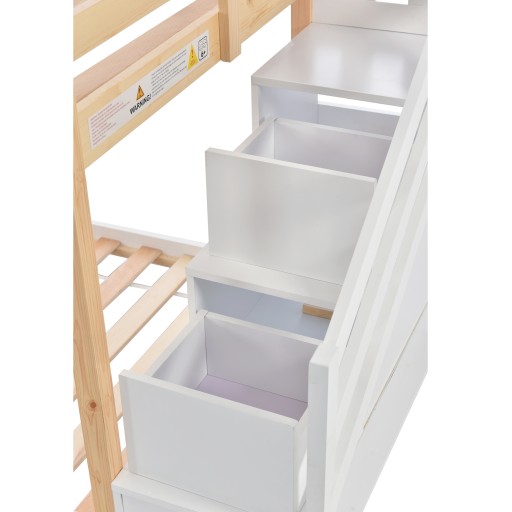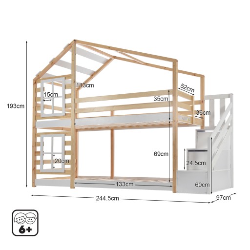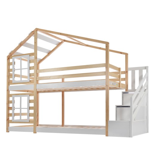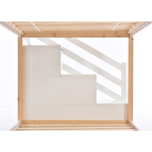 Łóżko dziecięce domek na drzewie z szufladą i zabezpieczeniem przed upadkiem 90 x 200 cm, łóżko na poddaszu dla dzieci - 2x ramy z listew - naturalny i biały