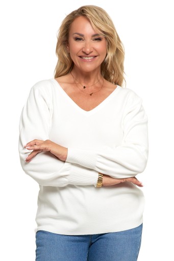 Najważniejszym elementem tego sweterka są lekko bufiaste długie rękawy, które nadają mu delikatny, modny akcent, jednocześnie zachowując subtelną klasykę. Dekolt w serek jest kobiecy i kuszący, podkreślając piękno szyi.