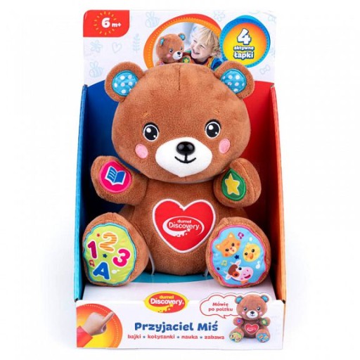 Czy wiesz, że istnieje sposób na przeniesienie się do bezpiecznego świata wyobraźni bez wychodzenia z domu? Przytul mocno misia i naciskaj na jego łapki, aby razem z nim odkrywać cudowne, bajkowe krainy, uczyć się alfabetu, cyferek oraz poznawać zwierzątka. Każda z misiowych łapek kryje w sobie inną niespodziankę! Poza bajkami, znajdziemy tu również kołysanki, piosenki w języku polskim, wierszyki i wesołe zwroty. Maluszek może mieć misia zawsze przy sobie. W ciągu dnia pluszowy przyjaciel zapewni mu wesołą rozrywkę, a wieczorem opowie bajkę lub zagra do snu słodką kołysankę.