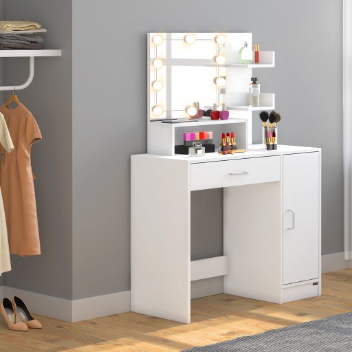 Duża, podświetlana szuflada i szafka z 2 przegrodami pod blatem oferują świetne rozwiązanie do przechowywania wszystkich kosmetyków lub biżuterii.