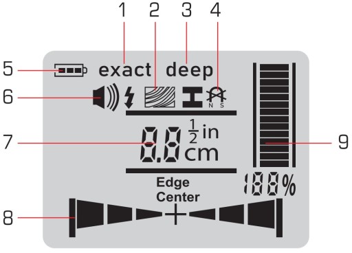 - deep - tryb głęboki, do wykrywania ciał obcych. Max. głębokość skanowania w tym trybie to 38mm.