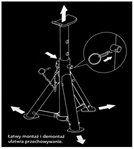 Podstawki pod samochód posiadają trzy składane łapy oraz trójstopniową regulację wysokości. Bolec zabezpieczający trwale połączony z podstawą. Doskonałe do odciążenia lewarka. Należą do podstawowego wyposażenia każdego warsztatu.