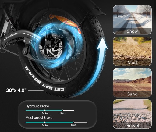 Gruba opona 4.0 o większym tarciu, która może dostosować się do różnych warunków jazdy, takich jak droga zaśnieżona, droga piaskowa, droga błotnista, droga szutrowa, a także płaski teren.
