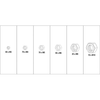 Zestaw 300 sztuk nakrętek nierdzewnych metrycznych zawiera rozmiary M3, M4, M5, M6, M8, M10. Całość umieszczono w wygodnym opakowaniu typu "sortownik".