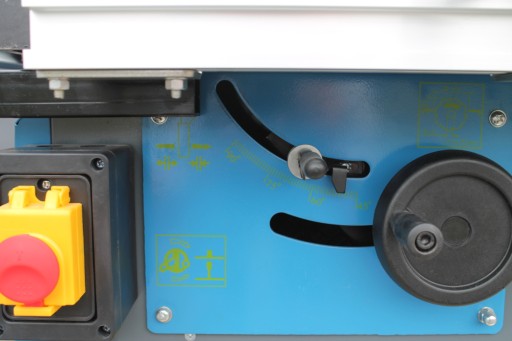 ✅ Na froncie maszyny znajdziemy wyłącznik bezpieczeństwa, pokrętło regulacji wysokości tarczy do 60 mm oraz pochyłu tarczy tnącej do 45°.