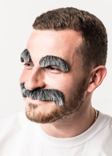 Brwi i wąsy ze sztucznych, siwych włosów. Mocowane na taśmę dwustronną.