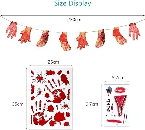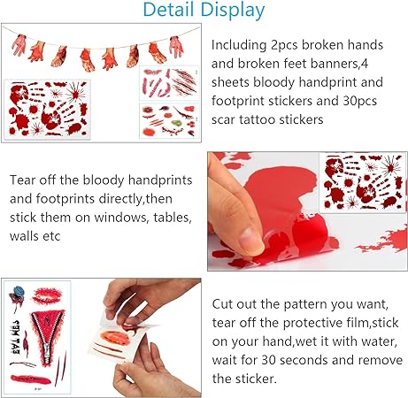 Te Halloweenowe naklejki z krwawiącymi rękami oraz banery z połamanymi rękami i stopami doskonale nadają się do stworzenia upiornej atmosfery na imprezach Halloween. Jasne, krwistoczerwone odciski dłoni i stóp tworzą realistyczny wygląd. Niewielka ilość rozprysków krwi sprawi, że będzie bardziej przerażający.