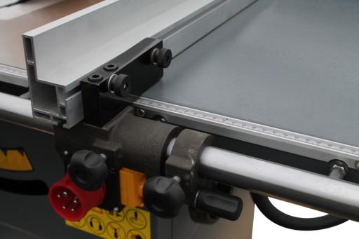 - Masywne prowadnice z podziałkami, wzdłużna (stalowa) oraz kątowa jak i przedłużenie stołu w standardzie.