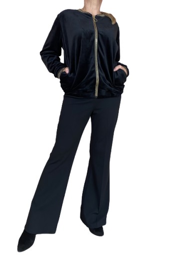 Bluza dresowa damska z mięciutkiego weluru w kolorze czarnym , zasuwana na ozdobny zamek w kolorze złotym .