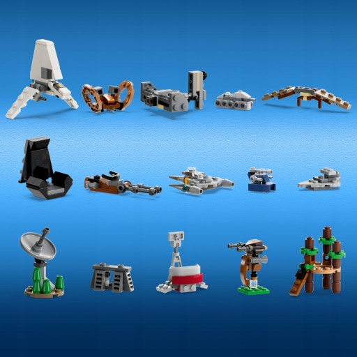 - ➡️ 15 miniaturowych modeli, w tym Justifier, śmigacz STAP, myśliwiec N-1 Mandalorianina, centrum dowodzenia klonów i wioska Ewoków.