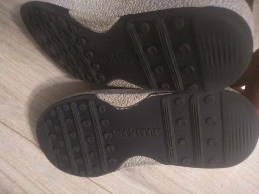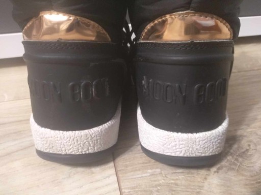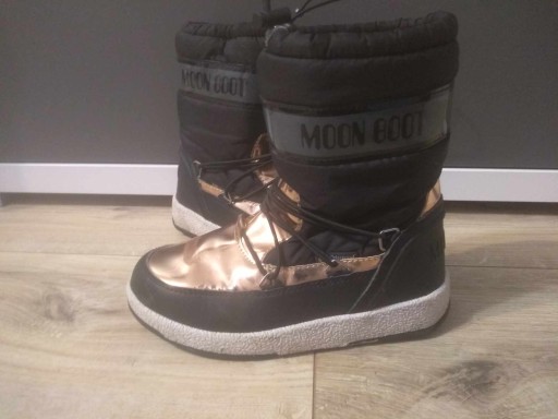 Moon Boot Soft WP size/rozmiar 34 śniegowce. Bez uszkodzeń ale na złotym kolorze na przodzie cienie i przebarwienia jak na ostatnim foto i delikatne otarcie na boku . Wkładka 20,5 tzn taki patyczek wchodzi do środka. Stan ogólny okolice dobrego.