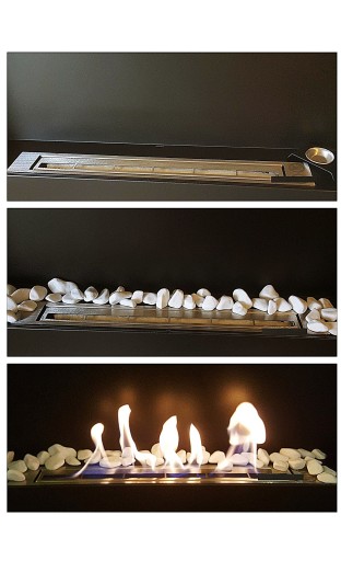 Biokominek posiada palnik liniowy z dwiema komorami (podwójne dno) oraz wkładem absorbującym.