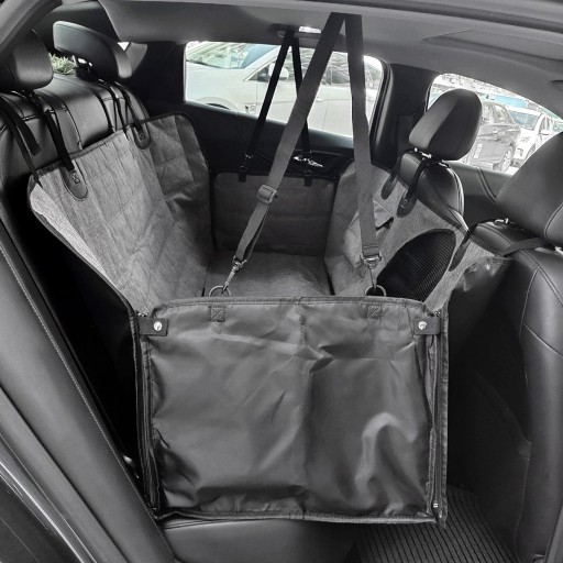Uniwersalna mata do samochodu dla psa lub kota na tylną kanapę z okienkiem umożliwiającym obserwację zwierzaka oraz suwakami pozwalającymi na podział maty na część dla psa i pasażera (możliwe jest przewożenie pasażera z tyłu razem z psem). Suwaki sprawiają, że możliwe jest rozdzielenie części siedzącej od przedniej, ochraniającej przednie fotele.