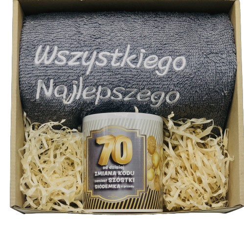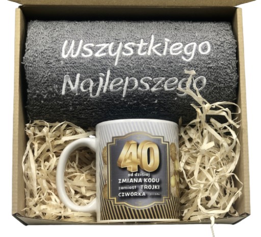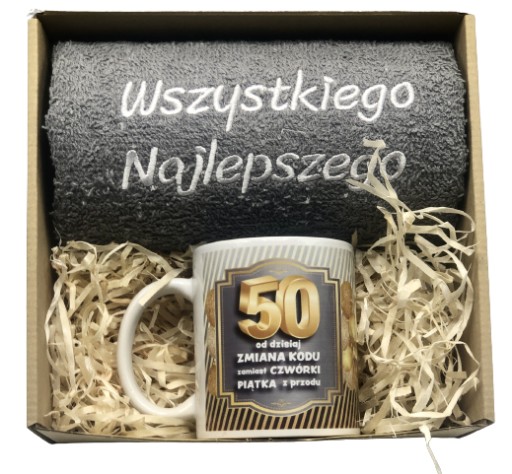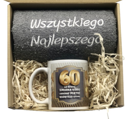 ✅ W zestawie znajduje się ręcznik z haftem Wszystkiego Najlepszego i kubek ceramiczny