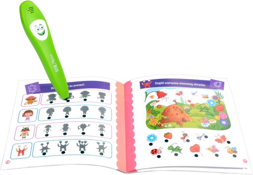 Rewelacyjna interaktywna książeczka z 36 stronami pełnymi interesujących zadań! Aby odpowiedzieć na zadanie, naciśnij końcówką długopisu czarną kropkę przy wybranej odpowiedzi. Po wybraniu prawidłowej, długopis wyświetli niebieskie światło oraz nagradza dziecko radosnym okrzykiem. Czerwone światło oznacza błędną odpowiedź. Pióro smutnym westchnięciem motywuje do kolejnej próby.