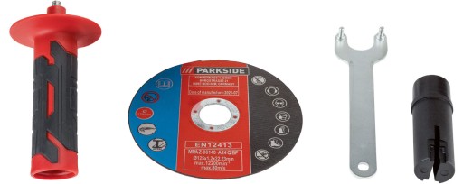 Dołączone akcesoria: 1x tarcza tnąca Ø 125 mm (grubość 1,2 mm, otwór 22,23 mm, maks. 12200 obr/min, maks. 80 m/s, ) 1x narzędzie do mocowania (klucz) 1x zestaw wymiennych szczotek węglowych