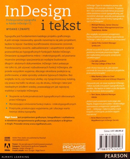 Profesjonalna typografia w Adobe InDesign CC Wydanie czwarte Typografia jest fundamentem każdego projektu graficznego. A jeśli istnieje niezawodny sposób rozwinięcia się jako projektant, będzie to lepsze i bardziej wyrafinowane stosowanie czcionek. Ten w pełni uaktualniony przewodnik pokazuje, jak za pomocą Adobe InDesign tworzyć piękne projekty typograficzne do druku i na ekran. Przy użyciu praktycznych przykładów, mnóstwa wskazówek i uwag zawierających dodatkowe szczegóły autor przedstawia wyczerpujący przegląd wszystkich funkcji tekstowych InDesigna, w tym funkcje Creative Cloud, które nie zostały ujęte w poprzednich wydaniach. Zaczynając od formatowania znaków, a następnie przechodząc poprzez formaty akapitów, style i efekty oraz układy stron, książka ta pozwala zdobyć umiejętności niezbędne do tworzenia pięknej typografii. Bardziej niż kiedykolwiek, współcześni typografowie muszą być przygotowani na tworzenie projektów, które będą używane w szerokim zakresie mediów, od drukowanej strony po wysokiej rozdzielczości ekrany urządzeń mobilnych, zaś to nowe wydanie InDesign i tekst jest doskonałym przewodnikiem. Nigel French jest projektantem graficznym, fotografikiem i wykładowcą w dziedzinie oprogramowania graficznego, zamieszkałym w Brighton w Anglii.
