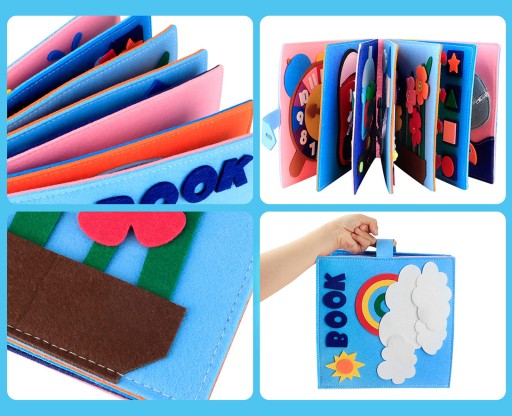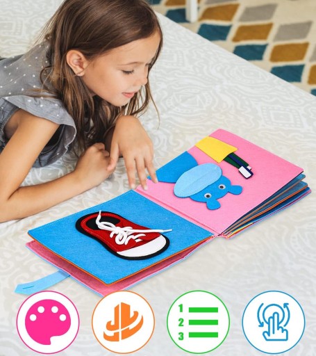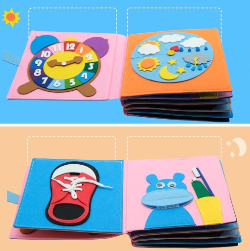 🌈 Filcowa książeczka dla maluchów zawiera różnorodne aktywności, takie jak kręcenie rękami, wiązanie sznurowadeł, zegarki, pogoda, hipopotam myjący zęby, płytki naciskowe, kolorowe puzzle, dopasowywanie gier, ciągnięcie rzodkiewki, naklejki sensoryczne itp.