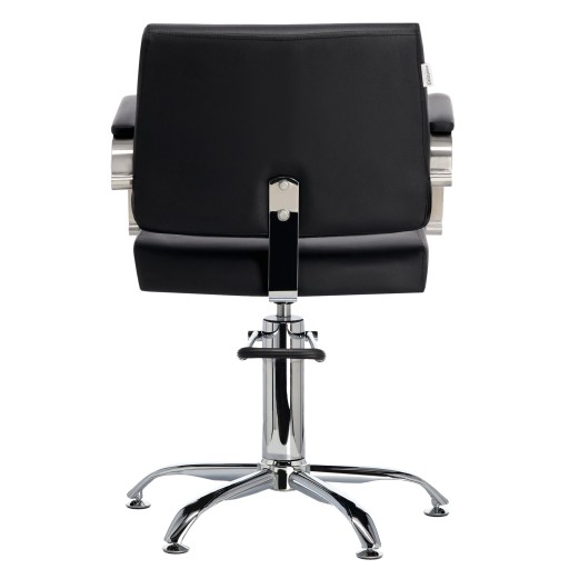 Fotel charakteryzuje się eleganckim i ergonomicznym designem, który pozwala na wygodną pracę fryzjera oraz relaks klientów.