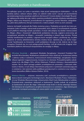 Autorzy tej książki wykonali dla Ciebie mnóstwo pracy. Dokładnie przyjrzeli się trzem potentatom rynku e-handlu i opracowali przewodnik, który ułatwi Ci uruchomienie na jednej z tych platform własnego kanału sprzedaży. A może zdecydujesz się działać równocześnie na AllegroeBayu i Amazonie? Jakąkolwiek podejmiesz decyzję, najpierw przeczytaj, jak przygotować sprzedaż na Allegro i jak prowadzić marketing w ramach tego serwisu. Wybierz dla siebie strategię obecności w tym portalu i opanuj narzędzia, które ułatwiają sprzedaż. Poznaj metody handlowania na polskiej i zagranicznych wersjach eBaya i przekonaj się, na jakie wsparcie ze strony administratora serwisu możesz liczyć. Upewnij się, czy warto rozpoczynać handlowanie na Amazonie, a jeśli podejmiesz decyzję na TAK, dobrze się do tego przygotuj. Dowiedz się, na czym polega growth hacking, czyli jak skutecznie ściągnąć użytkowników platform ofertowych bezpośrednio do swojego e-sklepu.
