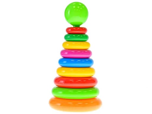 Układanka piramidka to klasyczna zabawka z czasów naszego dzieciństwa. Kolejne części piramidki trzymają sie na plastikowym drążku.