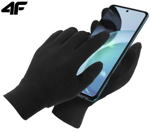 UWAGA! Przedmiotem oferty są rękawiczki 4F REU013 w kolorze czarnym. Pozostałe elementy służą wizualizacji funkcjonalności.