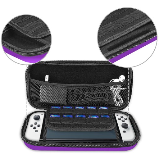 Etui jest idealnie dopasowane do Twojej konsoli Nintendo Switch OLED - idealnie ją zabezpiecza. Wewnątrz posiada specjalne przegródki mieszczące aż 10 kartridżów z grami. W górnej części futerału znajduje się specjalne miejsce na przechowywanie akcesoriów do konsoli takich jak ładowarka, powerbank, słuchawki, pudełka z gier, itd. Pokrowiec posiada także praktyczną smycz do przenoszenia.