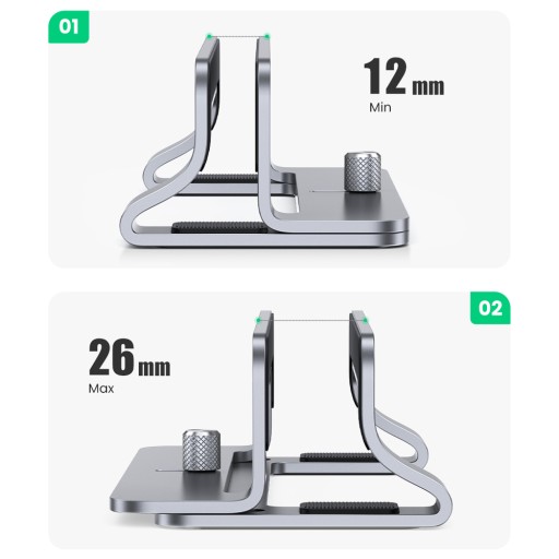 Podstawka została wyposażona w praktyczne pokrętło, które umożliwia regulację szerokości uchwytu. Dzięki temu akcesorium pasuje do większości laptopów – wszystkich, których grubość mieści się w przedziale od 12 do 26 mm.