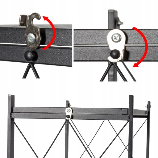Klamra metalowa umieszczona z tyłu umożliwia zablokowanie półek i tym samym całego regału w pozycji rozłożonej.