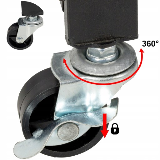 - Obrót każdego z kół o 360 stopni ułatwia manewrowanie i przemieszczanie regału w zależność od potrzeby.