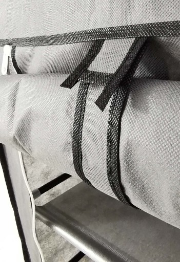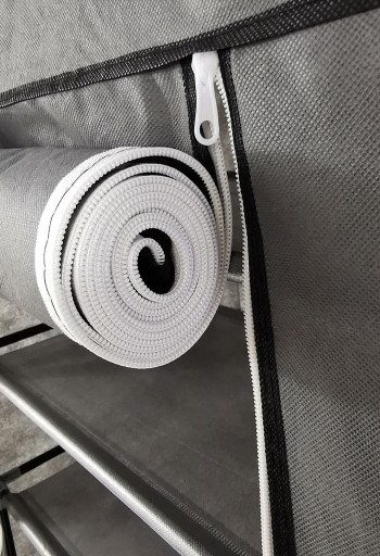 Zasłona drzwiowa wyposażona w rzepy i zamek błyskawiczny skutecznie zabezpiecza zawartość przed kurzem i zabrudzeniem. . Szafa tekstylna prezentuje się stylowo i pasuje do różnych pomieszczeń, takich jak sypialnia, korytarz czy garderoba.