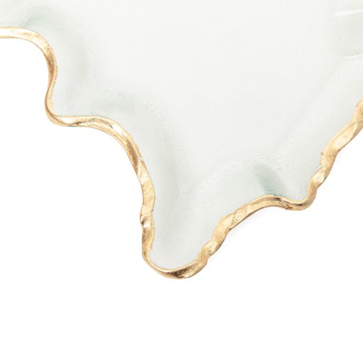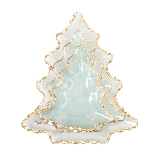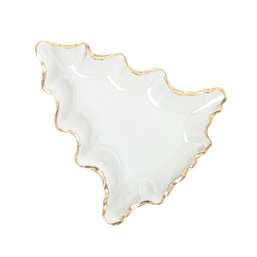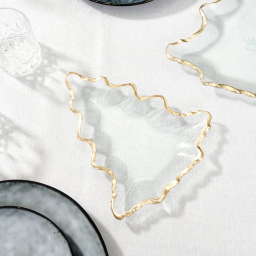 Dekoracyjny talerz HOMLA Elsoy w kształcie ośnieżonej choinki o wymiarach 28 x 26 cm. Wykonany z przeźroczystego szkła, posiada złocone ranty, które nadają mu uroczystego, eleganckiego wyglądu. Zaserwujesz w nim przekąski podawane na świąteczny stół, ale doskonale sprawdzi się też jako miseczka na słodycze.