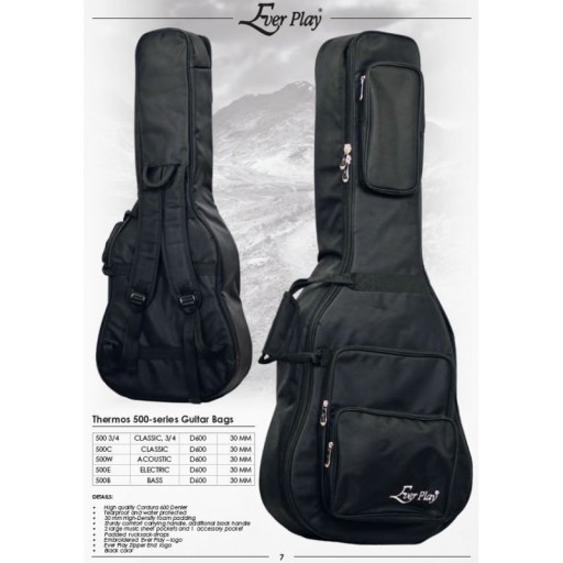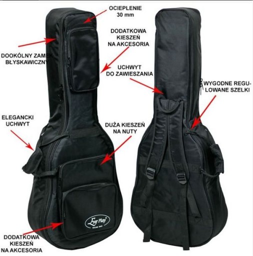 W ofercie pokrowców marki Ever Play znajdują się różne modele dopasowane do zapotrzebowania i typu gitary (C - klasyczna, W - akustyczna, E - elektryczna, B - basowa):