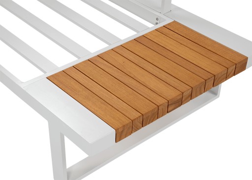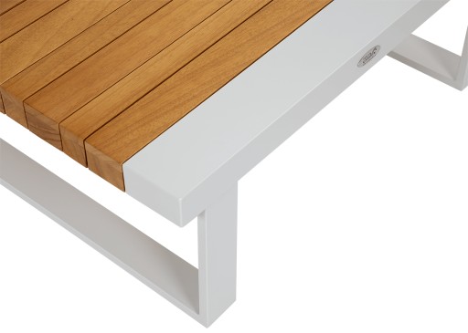 Wykonany z wysokiej jakości aluminium narożnik zapewnia trwałość i odporność na warunki atmosferyczne. Powierzchnia stolików wykonana jest z drewna eukaliptusowego, dodając wyjątkowego uroku i naturalnego akcentu całego zestawu. Dodatkowo samodzielny stolik kawowy o wymiarach 77x77x30cm zapewnia wygodną przestrzeń do serwowania napojów i przekąsek podczas letnich spotkań w ogrodzie.
