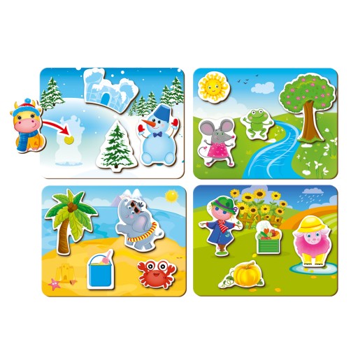 Pory roku: Gra z rzepami to edukacyjna, kolorowa gra, dzięki której dzieci nauczą się pór roku oraz ich najbardziej rozpoznawalnych cech.