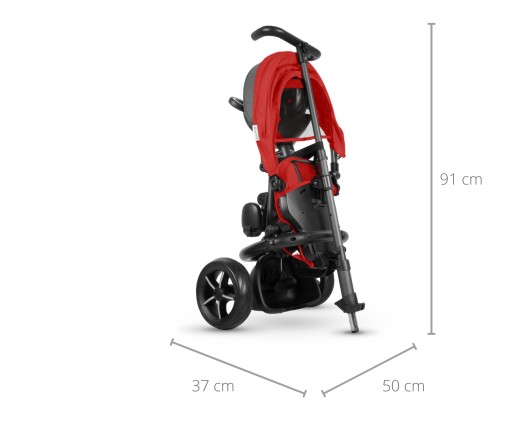 Budka rowerka jest wyposażona w siatkę, która pozwala na obserwację dziecka podczas jazdy. Daszek budki jest odpinany za pomocą suwaka, co daje możliwość dostosowania go do warunków atmosferycznych. Piankowe koła zapewniają płynną i cichą jazdę. Przednie koło posiada osłonkę zabezpieczającą przed wkręceniem się nóżki. Na tylnym kole znajduje się pojemnik na drobiazgi.
